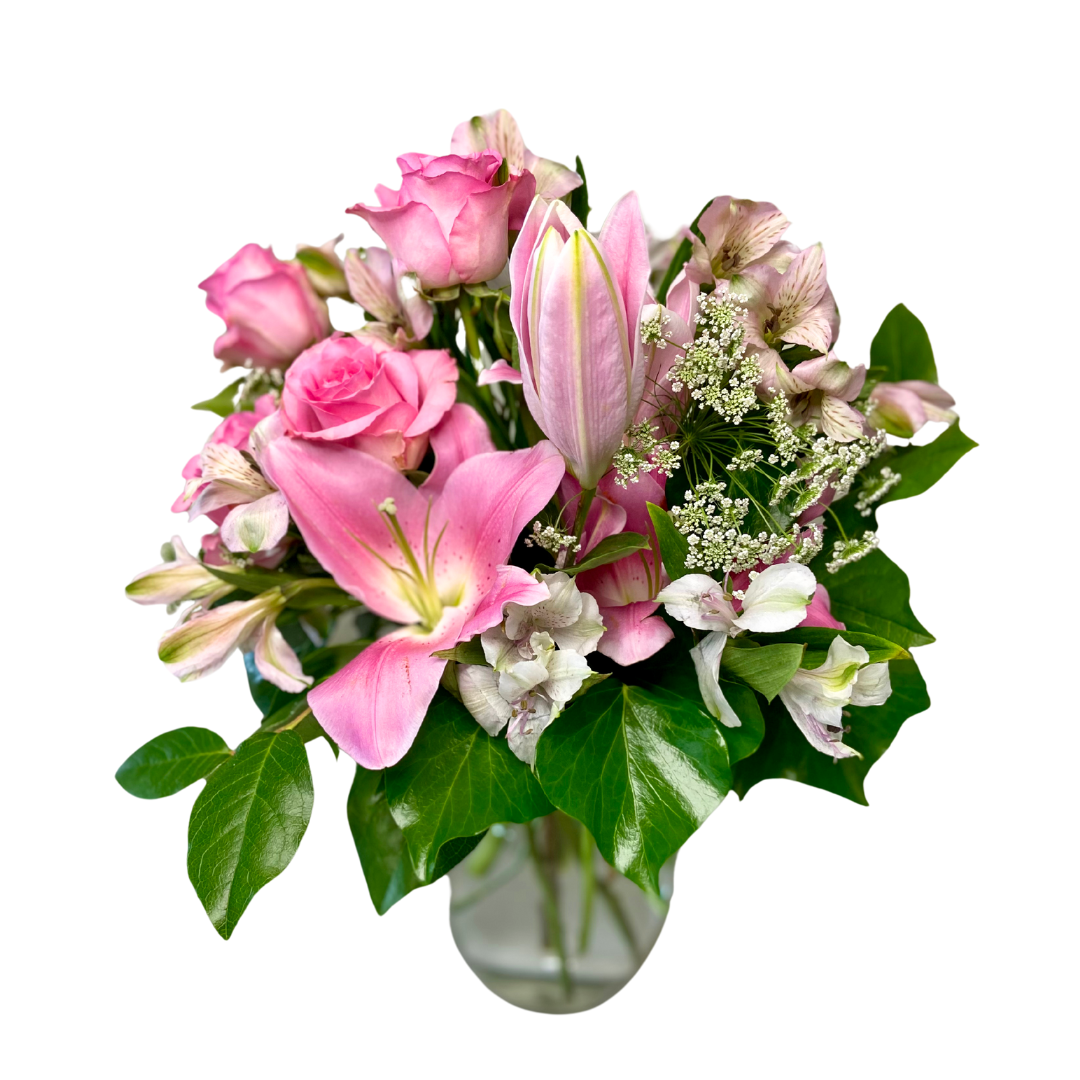 The sweetest hearts deserve pink. Pink roses, fragrant Oriental Liliies, and delicate filler flowers make this bouquet fragrant and beautiful.